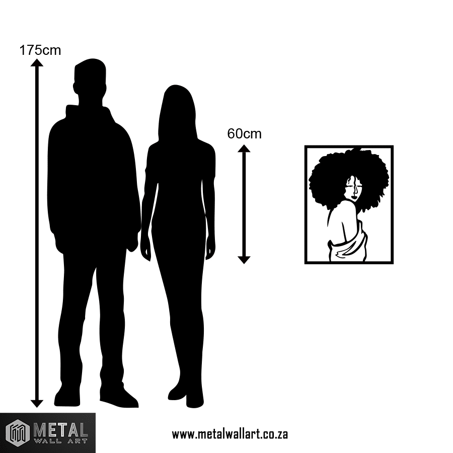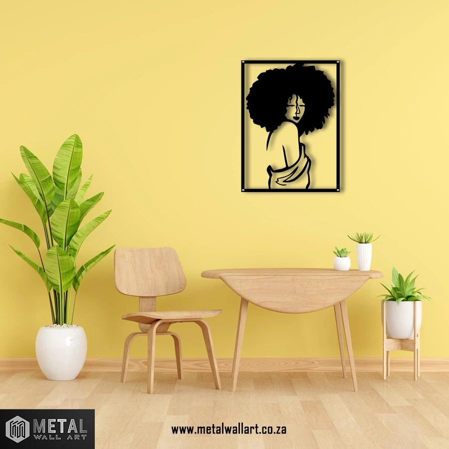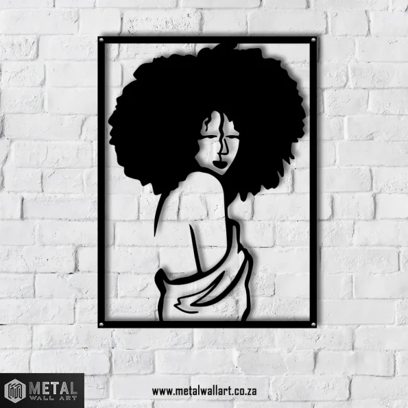 Afro hair is bold and is considered a sign of pride. Curls and Fro raised metal wall art features a semi nude women with a lot of pride! This alluring women wears her afro like a crown!